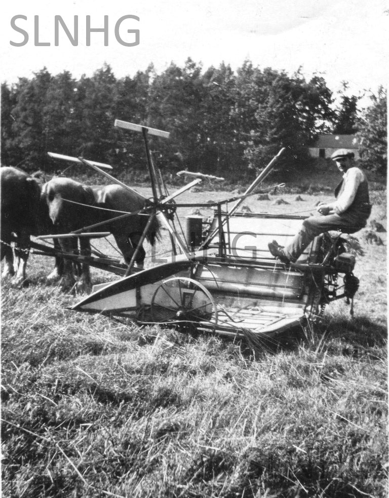 Picture taken at Gorthleck Mains showing Angus Mackenzie on the horse binder cutting corn , Note the three horses used to pull the binder .
