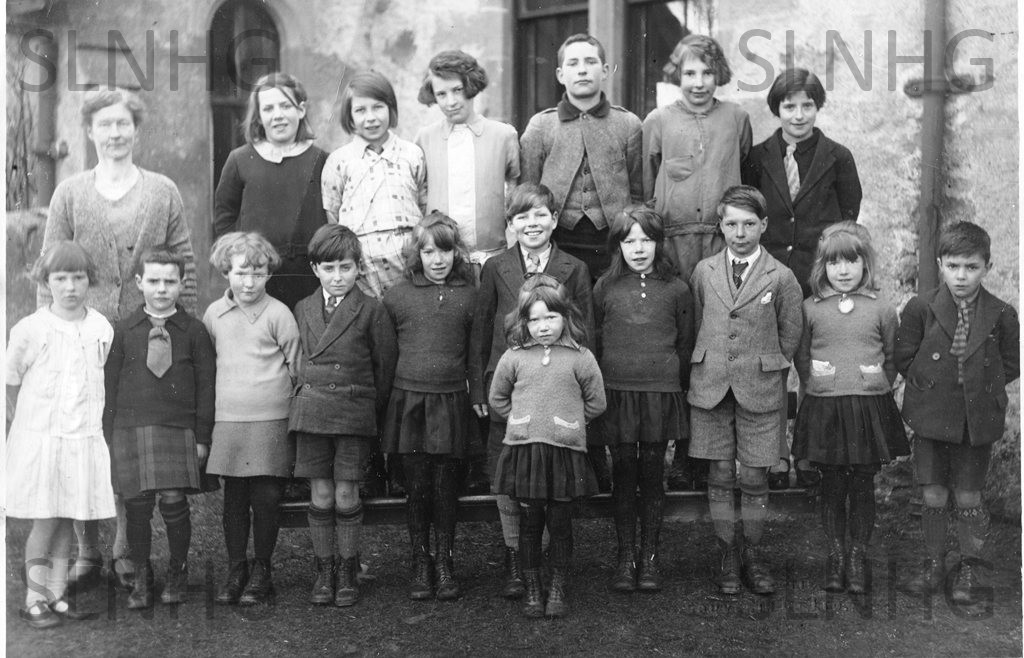 Back L-R Alfred Gordon (Ballagan ), Colin Campbell (Abersky), Willie Johnstone (Balachar), Hugh Fraser {Balnabeeran}, . Front L-R Billy Johnstone (Achnabatt), Catherine Campbell (Abersky), Christina (Ada) Johnstone (Achnabatt}, Ann Clark (Balchraggan) ,Ian Burnett (Ballaggan).