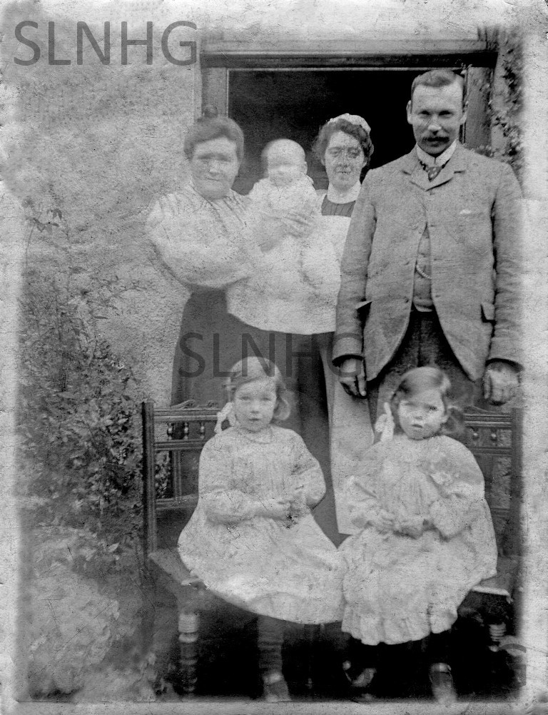 Donald and Barbara with youngest son Angus in arms, Daughters Helen and Meena seated on the chairs . With nanny Maggie Grant in the doorway. Photograph courtesy of Fiona Larg.